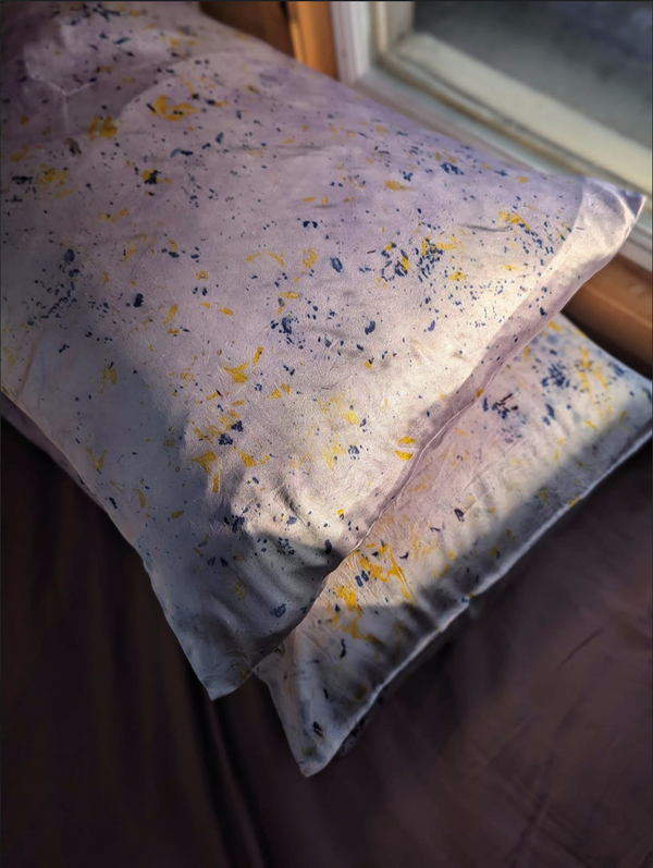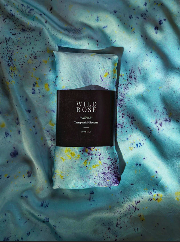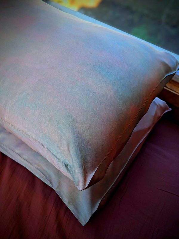 Our 100% silk, hand-dyed pillowcases, crafted with natural dyes, provide therapeutic benefits for your skin & hair. Made from high-quality silk, these pillowcases are gentle on the skin and hair, helping to reduce friction, which can prevent hair breakage and minimize sleep lines or wrinkles on the face. The natural dyes are derived from plants and other organic sources, making them less likely to irritate sensitive skin compared to synthetic dyes. Silk also helps regulate temperature, keeping you cool in the summer and warm in the winter, ensuring a comfortable and restful sleep. Each pillowcase is unique due to its hand-dyed process, adding a personal, artisanal touch to your bedding that reflects sustainable and mindful choices. Transforming nature into your home.