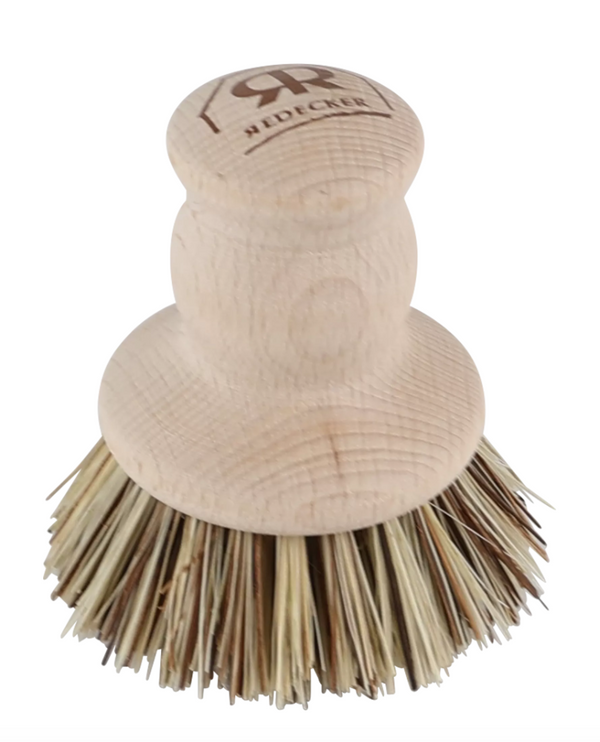 Heavy duty pot brush crafted by hand, made with durable natural fibers and beechwood. The smart design allows the pot brush to be firmly gripped and worked with one hand, reaching the toughest corners and edges of pots and pans.