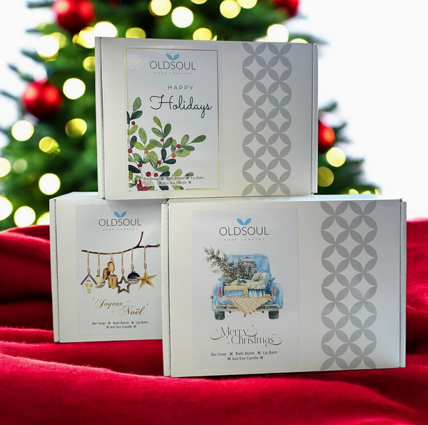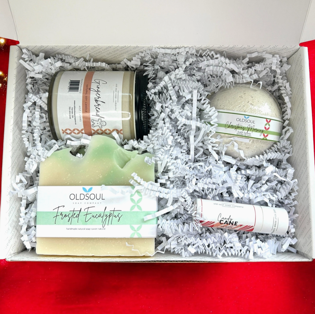 Large Holiday Gift Box: Enjoy an assortment of our Christmas goodies all in one box! A perfect Christmas party gift, housewarming or just because... The box contains a Christmas soap, a bath bomb, a Candy Cane lip balm and a Holiday themed 6oz Soy Wax Candle