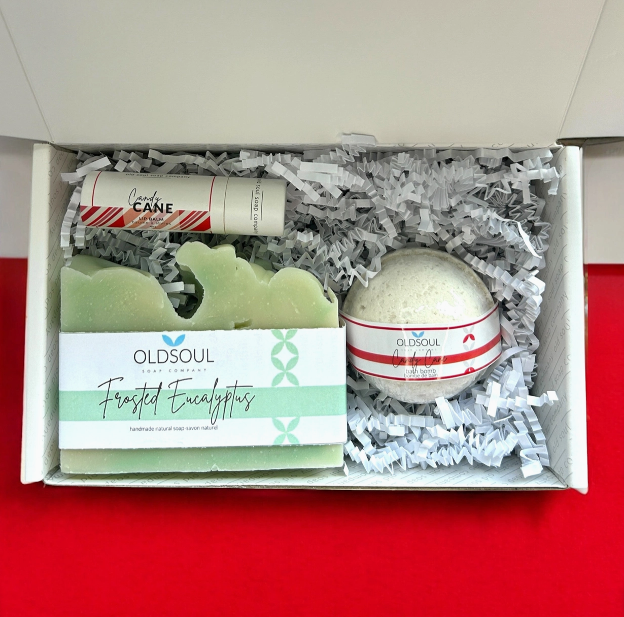 This Small Holiday Gift Box may be tiny, but it packs a punch! With a perfectly curated selection of festive gifts, you'll be ready to celebrate the season in style. Box includes one of our Holiday soaps, one Candy Cane lip balm, and one Eucalyptus shower steamer.