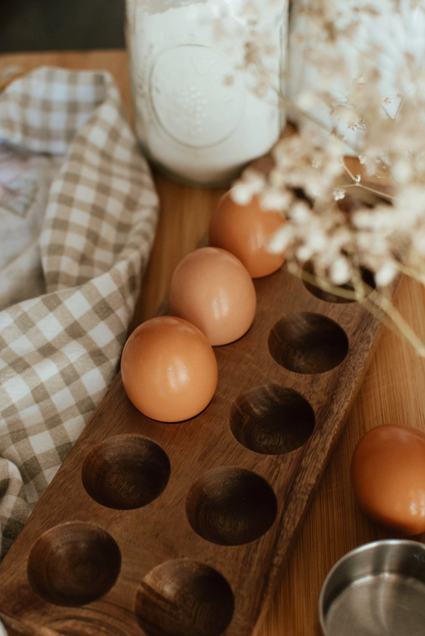 This countertop Egg Holder is made of sustainably sourced acacia wood. For farm fresh eggs that stay on your counter!