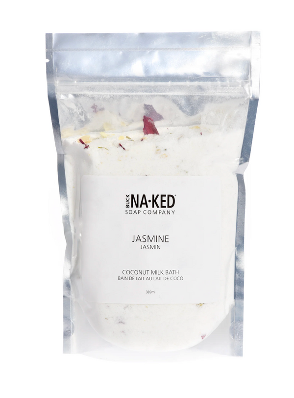 JASMINE: Combined with romantic jasmine essential oil and coupled with jasmine and rose petals, this coconut milk bath is lush and helps provide the perfect backdrop for a relaxing night in.