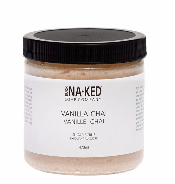 VANILLA CHAI: Formulated with both white and brown sugars as well as a blend of essential oils, this scrub helps cleans, exfoliate and feed skin.
